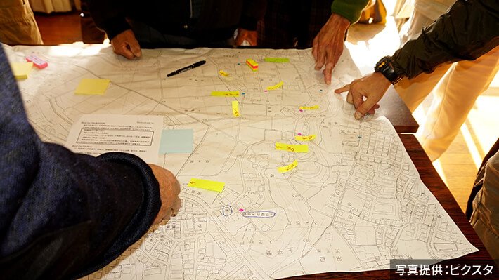 そのためには、地図を囲んで「自分たちのまちをどうしたいのか」を地域住民・団体・企業・行政が一体となって話し合うことが望まれます。こうした協働により、空き家対策とまちづくりを結びつけることができます。