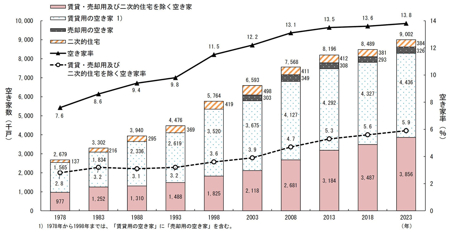 2023年に行われた国の調査によると、全国で約900万戸の空き家があります。住宅総数は約6,500万戸ですから、空き家率は約13.8%、つまり7戸に1戸ほどです。