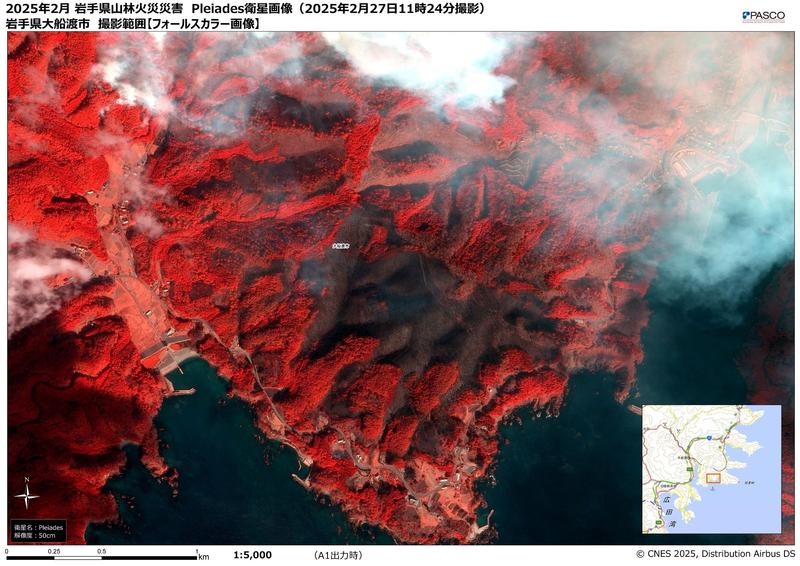 日本でも2025年2月に岩手県大船渡市で大規模な山林火災が発生し、国内最大級の被害となりました。発生当時は15日連続で乾燥注意報が出されていたそうです。火災の影響で植生が減少したことは、人工衛星でも確認することができ、その痕跡が広域にわたって可視化されています。